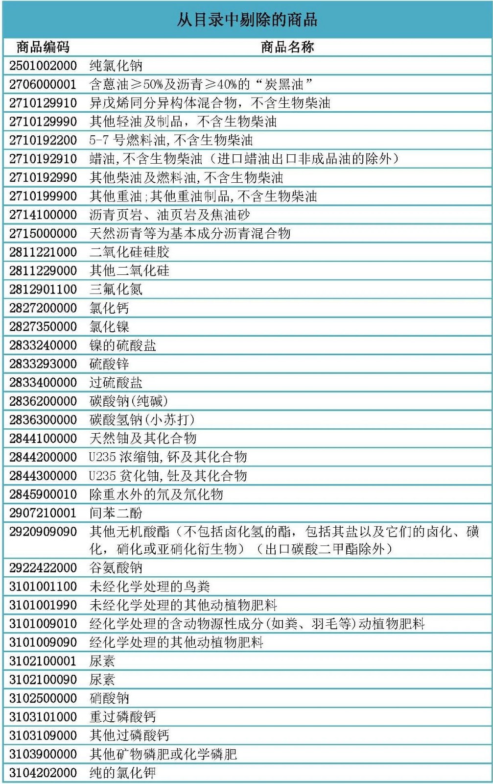剔(ti)除了199個(ge)十位商(shang)品編碼(ma),包括純(chun)堿、小蘇(su)打、尿素(su)、硝酸鈉(na)、硫☠️酸鉀(jia)、钛白粉(fen)等化學(xue)品。