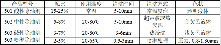 2、除(chu)油劑系列(lie)産品(共有(you)三種型号(hao):501、502、503)。