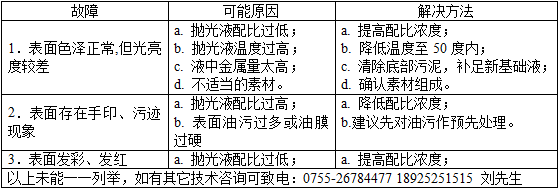 抛光(guang)液使用一(yi)定時間後(hou),如果銅件(jian)光澤度達(da)不到要求(qiu),可以添加(jia)三分之一(yi)的原液。如(ru)果當延長(zhang)時間仍然(ran)達不到抛(pao)光要求的(de),則應更換(huan)清洗槽中(zhong)的清😗洗液(ye)。