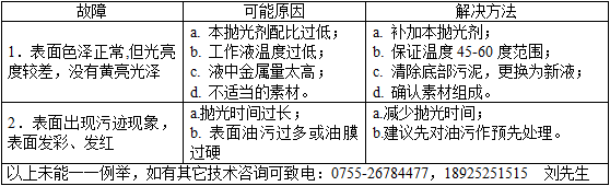 抛光液(ye)使用一(yi)定時間(jian)後,如果(guo)銅件光(guang)澤度達(da)不到☠️要(yao)求,可以(yi)添加三(san)分之一(yi)的原液(ye)。如果當(dang)延長時(shi)間仍然(ran)達不^到(dao)抛光要(yao)求的,則(ze)應更換(huan)清洗槽(cao)中的清(qing)洗液。
